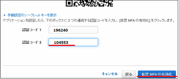 5-3 コード2入力後、仮想MFAの有効化をクリック