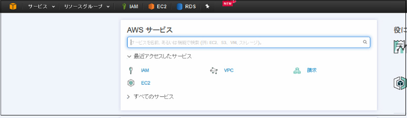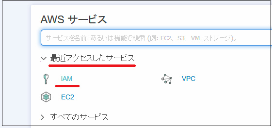 2-2 コンソールログイン後、最近アクセスしたAWSサービスまたは、サービスから 「IAM」を選択する