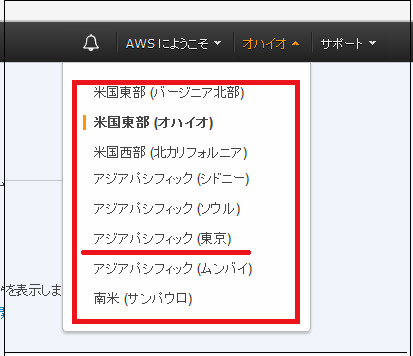 一覧が表示されている状態で、変更したいリージョンを指定してあげれば、リージョンが変更されます。