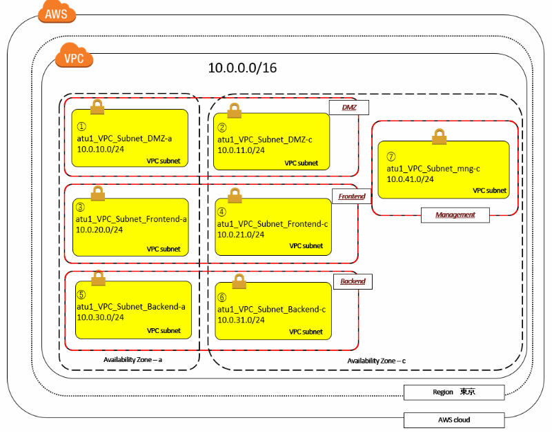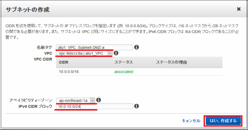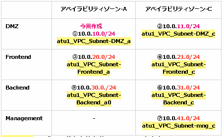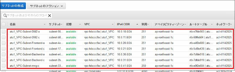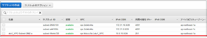 • 名前タグ:atu1_VPC_Subnet_DMZ_a