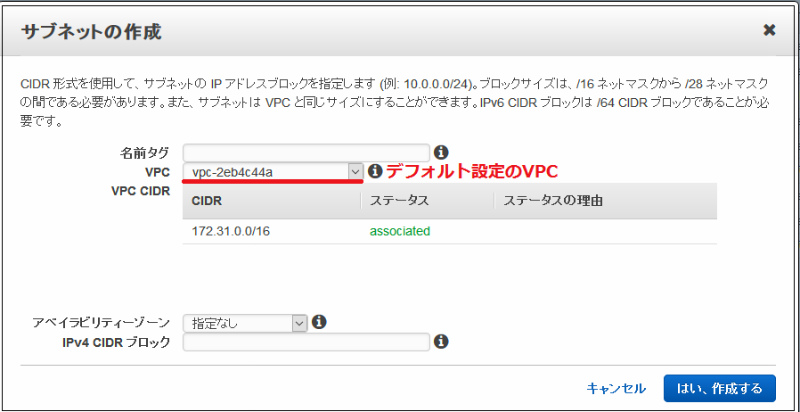 すでに2つ(デフォルトVPCに対して2つのアベイラビリティゾーン別のサブネット)できていますが、無視して新たに作成します。